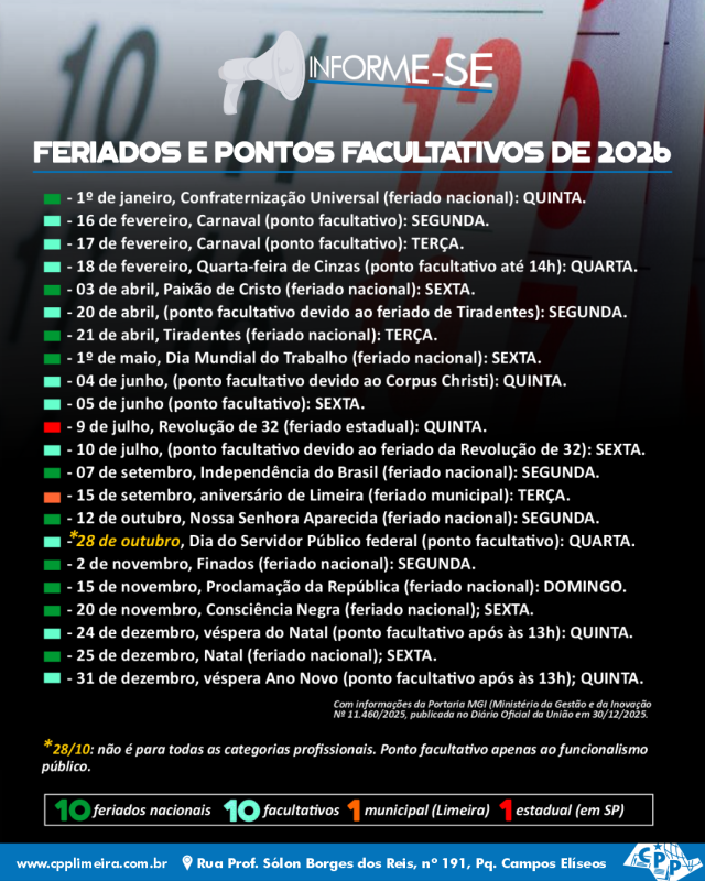 No infográfico deste post logo abaixo do texto, além dos nacionais, estão listados também: dia 9 de julho (feriado estadual em São Paulo, Soldado Constitucionalista de 32); 15 de setembro (feriado municipal, aniversário de Limeira) e 28 de outubro (ponto facultativo, Dia do Funcionalismo Público).