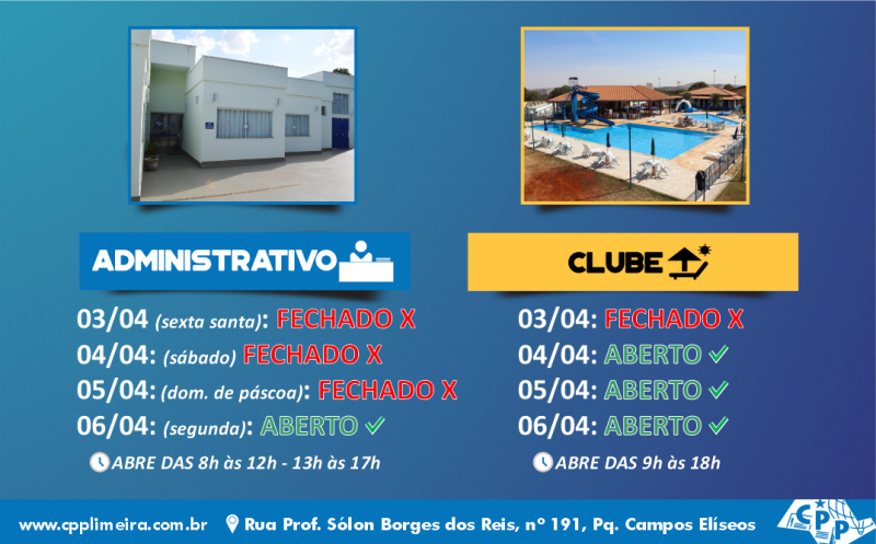 Administrativo do CPP-Limeira, e o clube, não abrem na sexta (03) devido ao feriado. No domingo de páscoa (05) o clube abre normalmente. Veja detalhes abaixo: